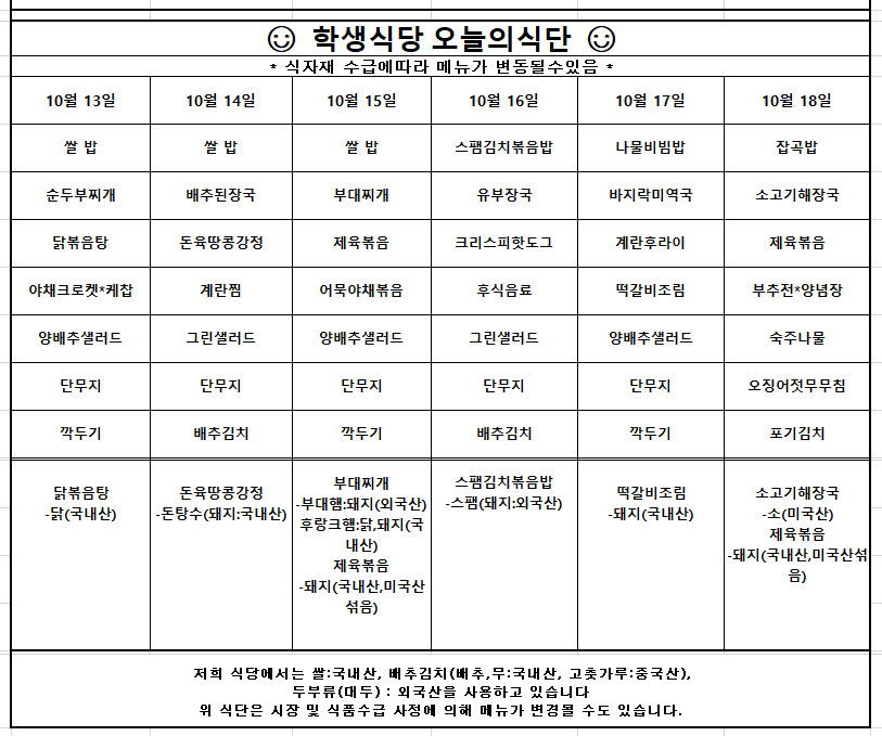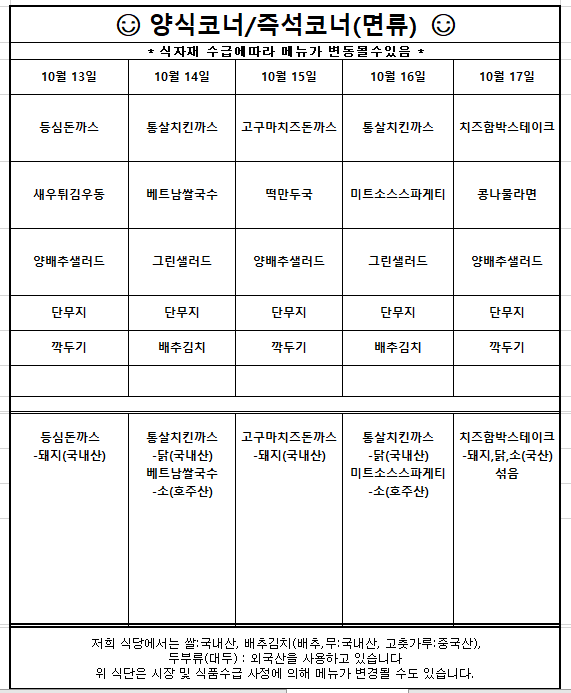 [공지] 10월3주차 학생식당 주간식단 안내입니다. N