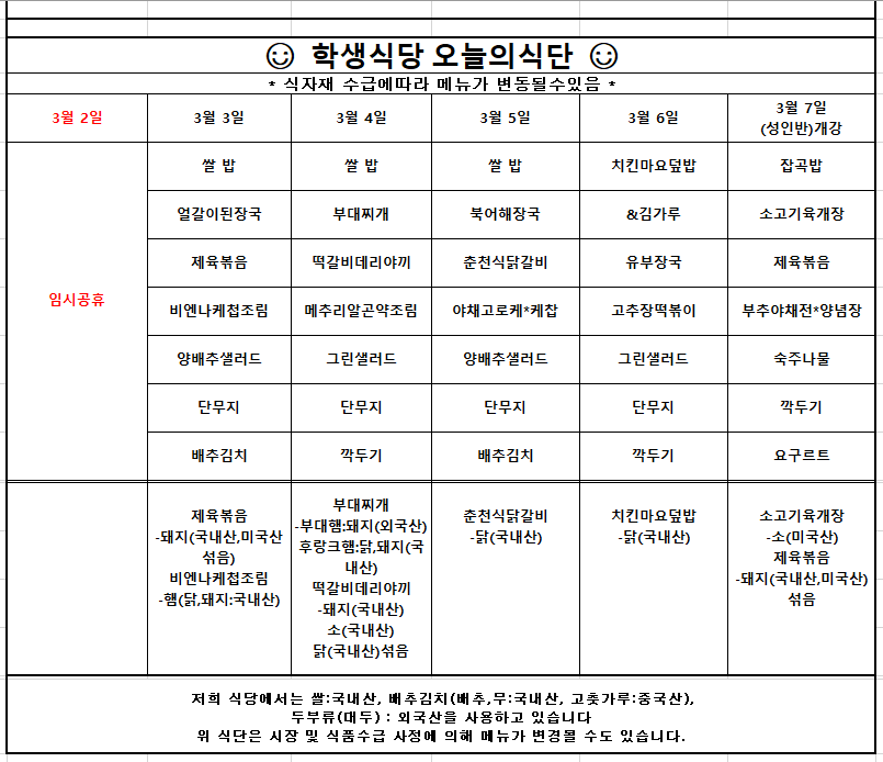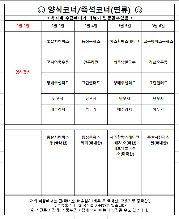 [식단표(천원의 아침밥)] 3월1주차 학생식당 주간식단 안내입니다. N