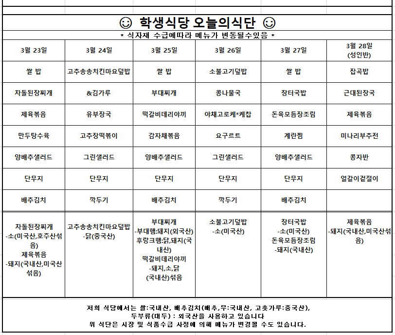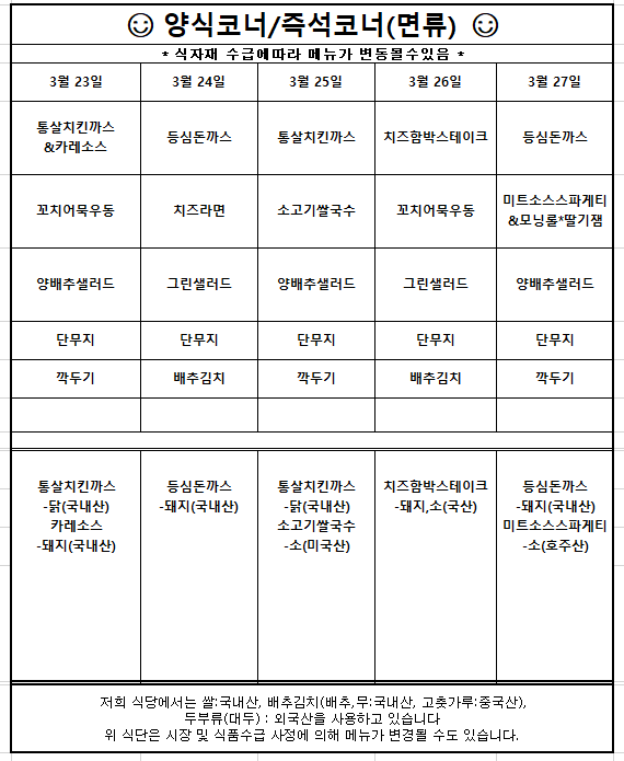 [식단표(천원의 아침밥)] 3월4주차 학생식당 주간식단안내입니다. N