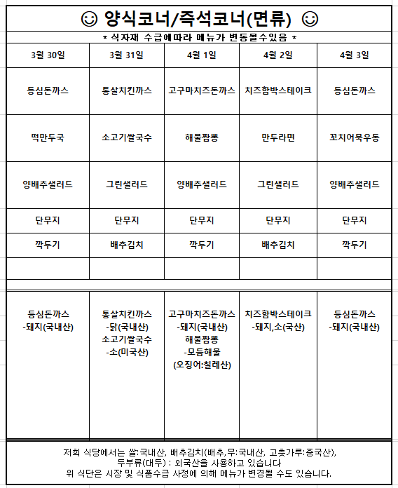 [공지] 4월1주차 학생식당 주간식단 안내입니다. N